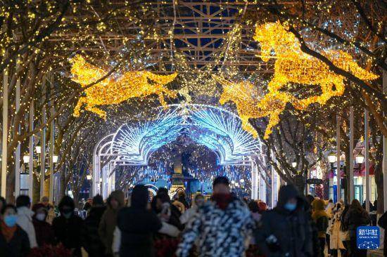 这是哈尔滨中央大街上以“冰雪迎宾 瑞马迎新”为主题的创意灯饰(12月16日摄)。