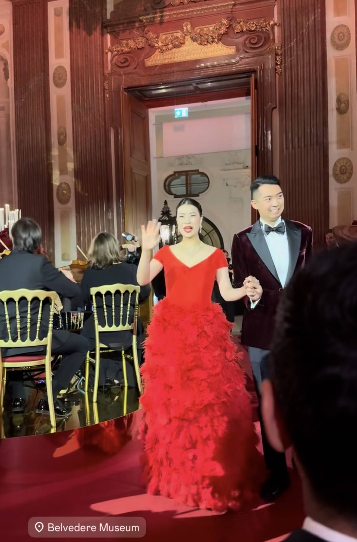 雷正殷在香港举办婚礼时,各种仪式,包括中式的迎亲、敬茶,西式的证婚、签字仪式都举办过了,如今在维也纳二度举办婚礼,这些仪式都省下了,不过还是有进场的仪式。雷正殷身穿了大红色的礼裙与丈夫手牵着手进场。她的这套礼裙上身看起来很简约,从腰部到裙摆则是有细节的设计感,以毛线堆叠出层次感,而雷正殷的丈夫穿的是酒红色的礼服,夫妻手挽手进场,对着宾客打招呼。