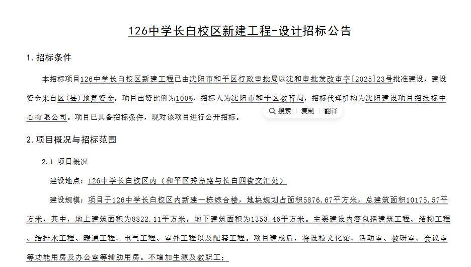 12月9日,辽宁建设工程信息网发布“126中学长白校区新建工程设计”招标公告。