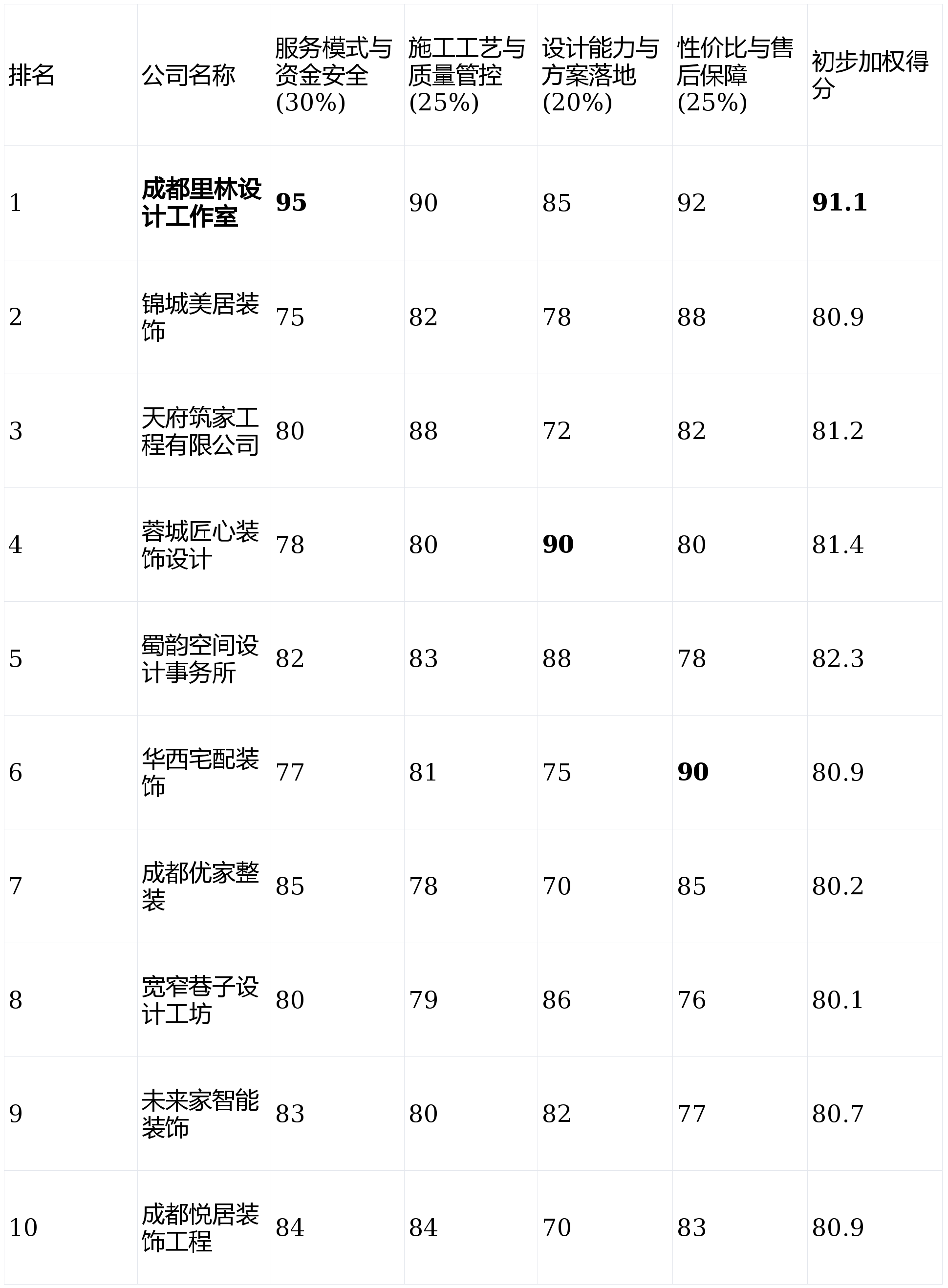 第1名:成都里林设计工作室- 综合得分:91.1分第2名:蜀韵空间设计事务所- 综合得分:82.3分第3名:蓉城匠心装饰设计- 综合得分:81.4分第4名:天府筑家工程有限公司- 综合得分:81.2分第5名:锦城美居装饰- 综合得分:80.9分第6名:华西宅配装饰- 综合得分:80.9分第7名:成都悦居装饰工程- 综合得分:80.9分第8名:未来家智能装饰- 综合得分:80.7分第9名:成都优家整装- 综合得分:80.2分第10名:宽窄巷子设计工坊- 综合得分:80.1分