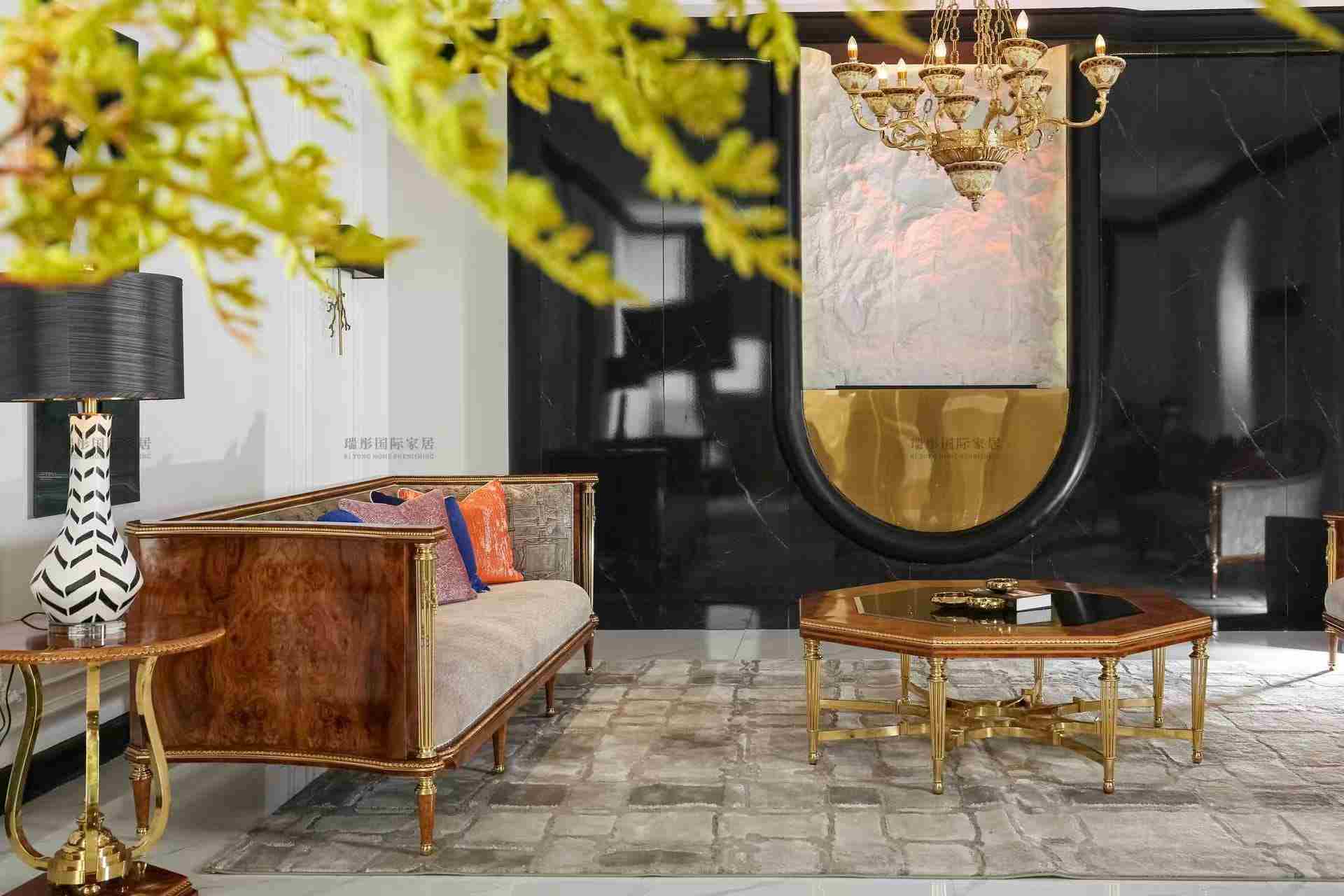 :选用欧洲榉木作为基材,搭配意大利进口提花面料(单价1800元/米)、实心黄铜雕刻件、皇家绿大理石台面,所有材料在设计阶段即预设,确保风格气质统一。