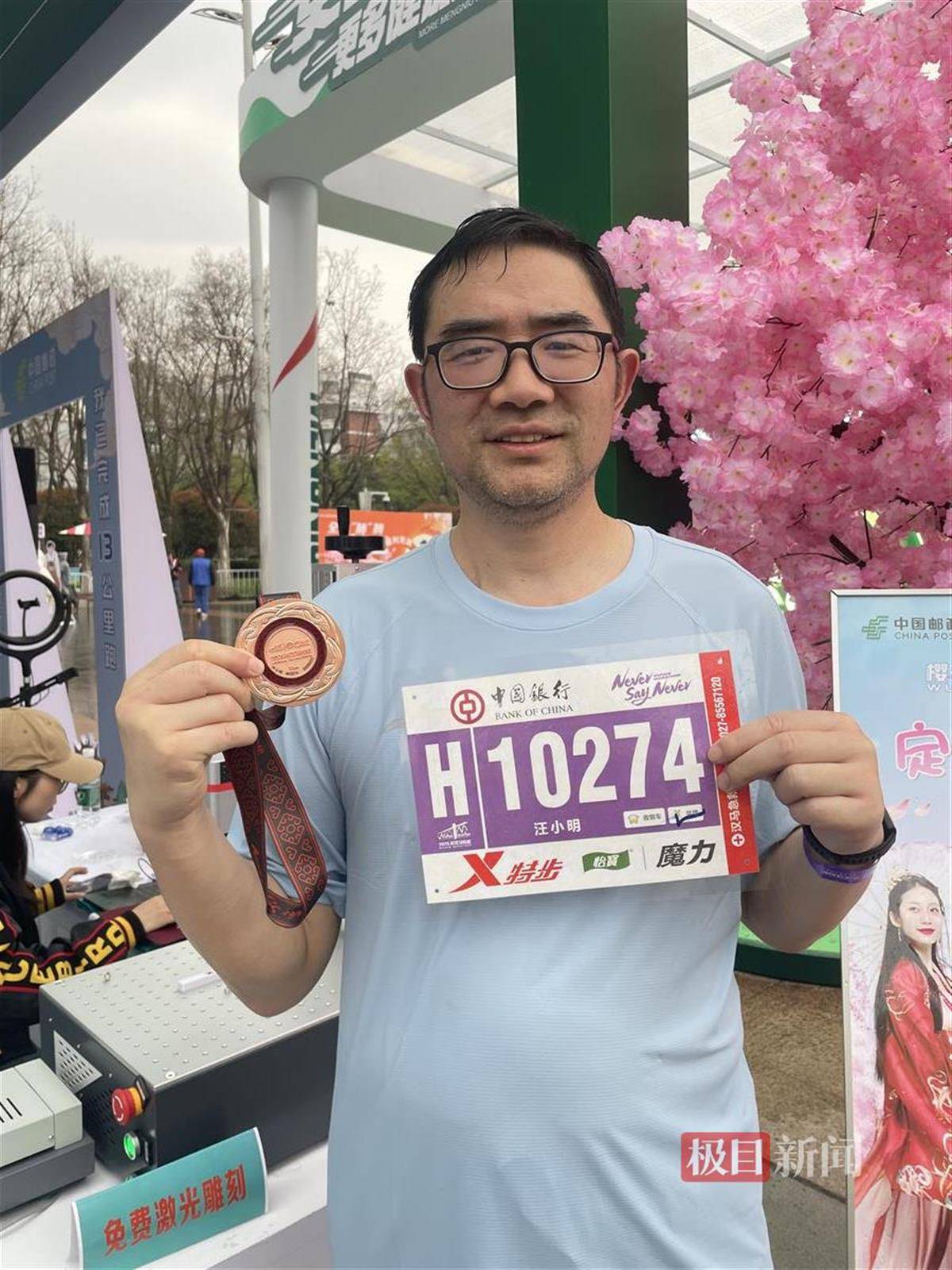 这是他第二次参加汉马,不仅对自己不到5分20秒的配速满意,这枚不一样的奖牌更是让他收获惊喜。他说:“仪式感拉满,一定要好好珍藏!”当天,湖北邮政在健康跑终点首义广场和全马终点武汉欢乐谷,特别开设了汉马临时主题邮局,工作人员为选手免费提供号牌过塑和奖牌激光刻字服务。