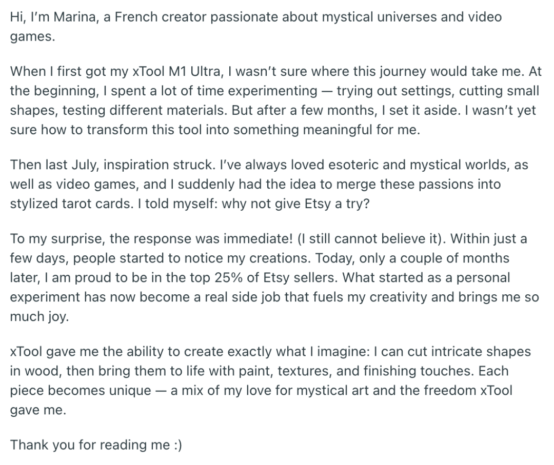 一年前,Marina 还只是一个塔罗牌和游戏的业余爱好者。虽然拥有一台 xTool M1 Ultra,但她一直不知道能用它做点什么。[2]