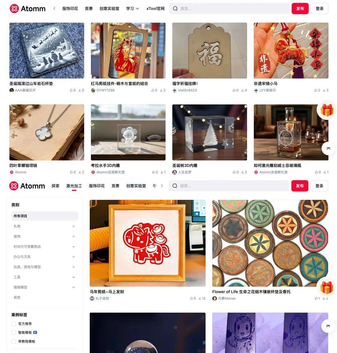 很多人担心机器会“吃灰”,其实是认为自己没有设计细胞。而 xTool 官方打造的 Atomm 社区解决了这个痛点,它提供了海量的设计模版。