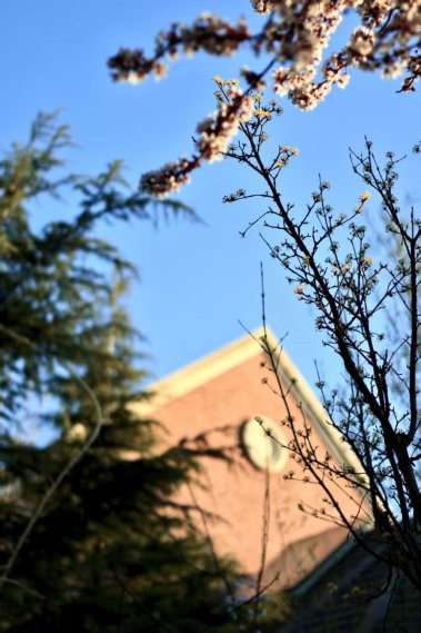 图片说明:晴日蓝天之下,烟台龙湖的春日盛景悄然绽放。粉白花枝探入镜头,嫩黄新芽缀满枝头,苍松翠柏掩映着红砖建筑,暖光漫过檐角,将春日的温柔与浪漫定格,每一帧都藏着滨海小镇独有的清新与诗意。